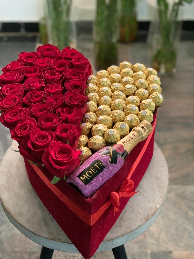 red roses, chocolates and wine for her birthday